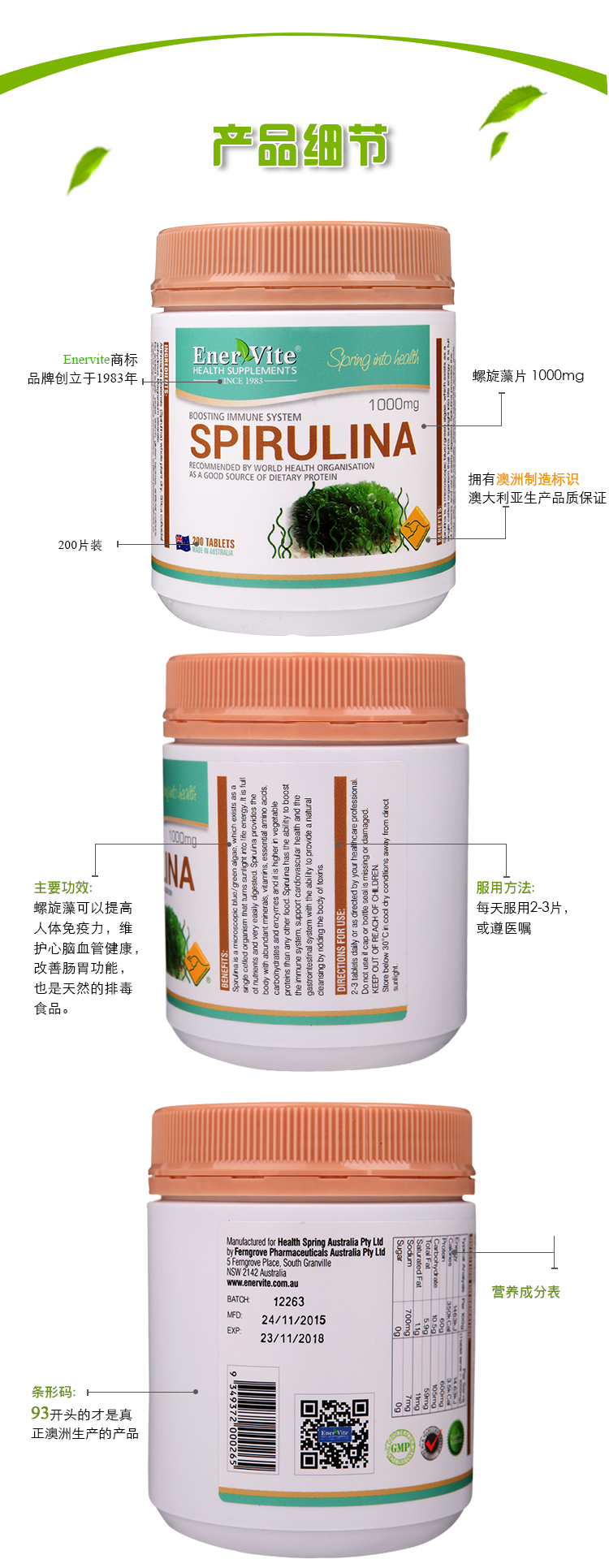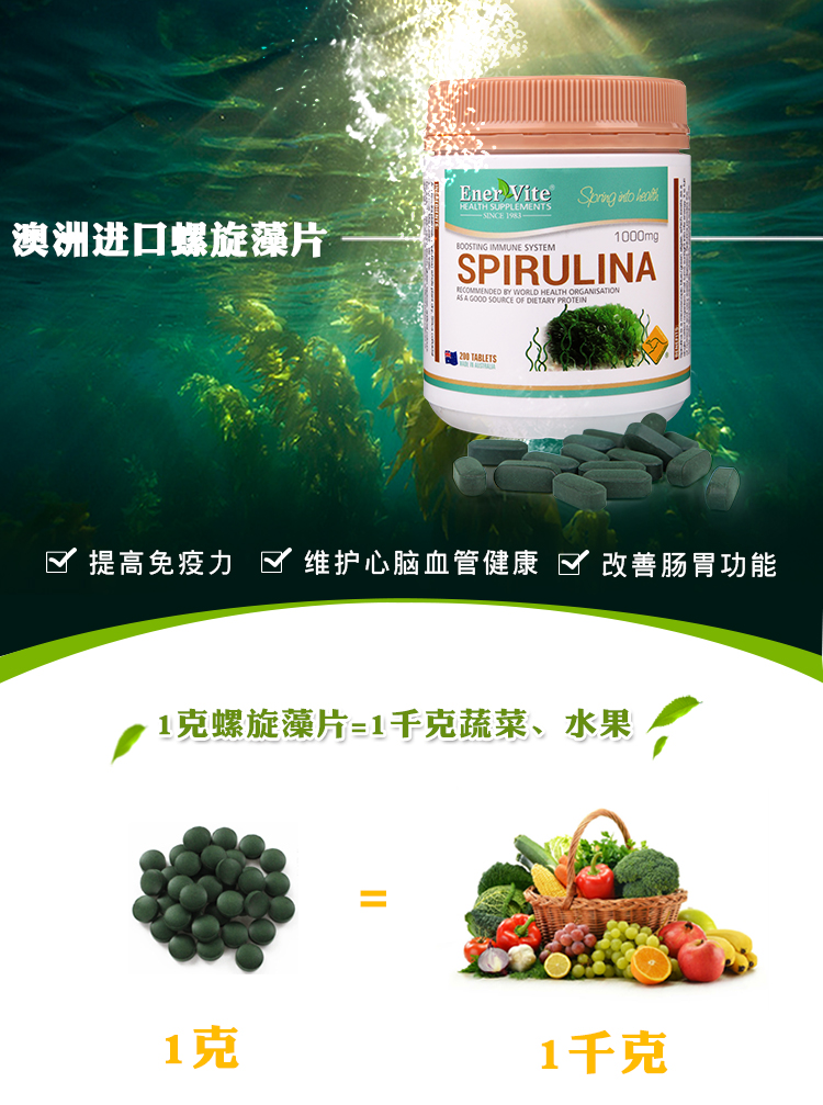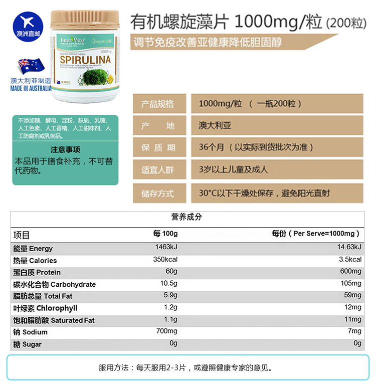 • 【澳洲仓】Enervite/澳乐维他 螺旋藻片 1000mg  200片