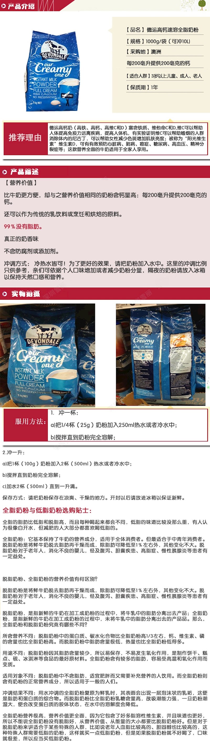• 【澳洲仓】【3袋包邮】Devondale 德运 全脂高钙成人奶粉 学生中老年牛奶粉 1kg