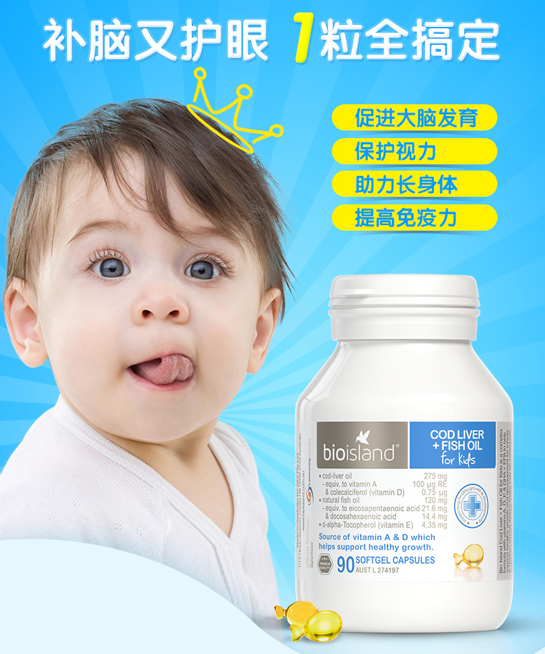 • 【澳洲仓】BIO ISLAND 鱼肝油90粒 儿童宝宝婴幼儿鳕鱼肝+鱼油补脑护眼